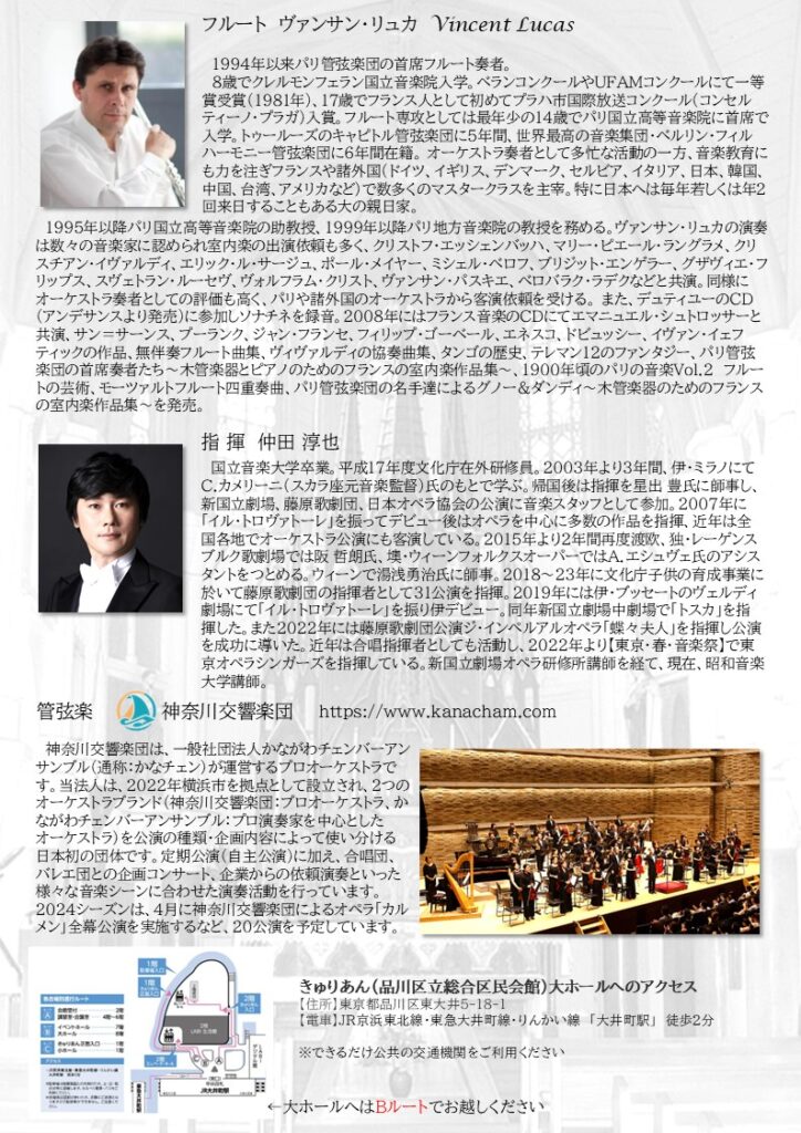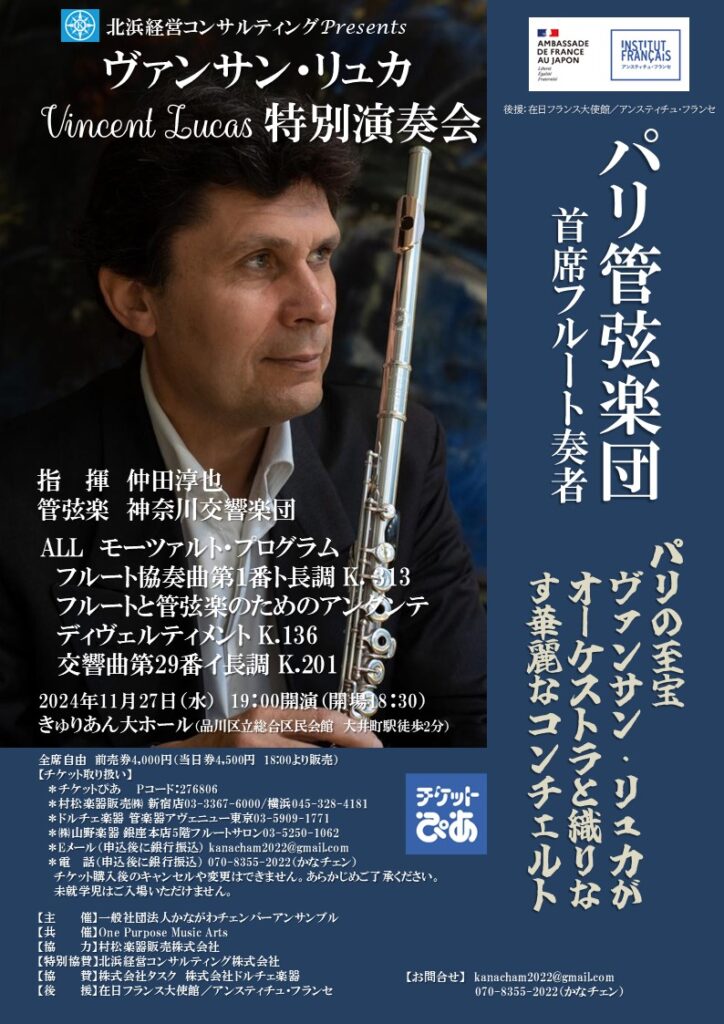 ヨーロッパを代表する名門・パリ管弦楽団首席フルート奏者 ヴァンサン・リュカ氏来日記念公演を実施いたしました。来場者の皆様からは、「フルートの音色がこんなにも素敵だったとは!」と感激の声が鳴りやまず、また彼の気さくな雰囲気がとても好印象でした。アンコールでは、自らオーケストラの一員となり一緒にノリノリで演奏してくれるなど、聴衆を魅了しました。